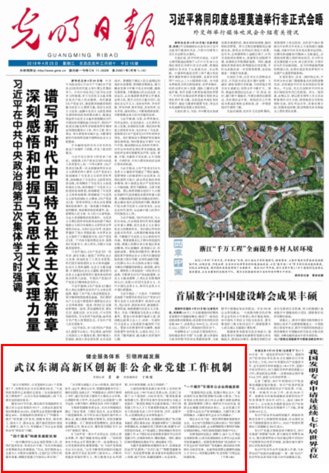 ? ? ? ? ??發揮黨組織創造力、凝聚力、戰斗力,引領企業創新發展,已成為東湖高新區眾多非公企業成功的普遍模式。4月25日,《光明日報》就“武漢東湖高新區創新非公企業黨建工作機制”進行了頭版重點報道,引發關注和思考。