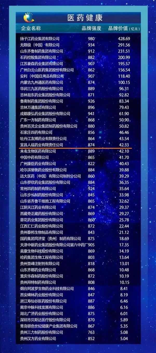 ? ? ? ?2019年5月9日,由新華社、經濟日報社、中國國際貿易促進委員會、中國品牌建設促進會、中國資產評估協會等單位聯合舉辦的“2019中國品牌價值評價信息發布”活動在上海舉行。在此次發布會上,醫藥健康板塊共49個品牌上榜,宜昌人福藥業公司品牌價值位居第18位,品牌強度為874,品牌價值42.33億元,較2018年的評估價值40.27億元有了進一步提升。
