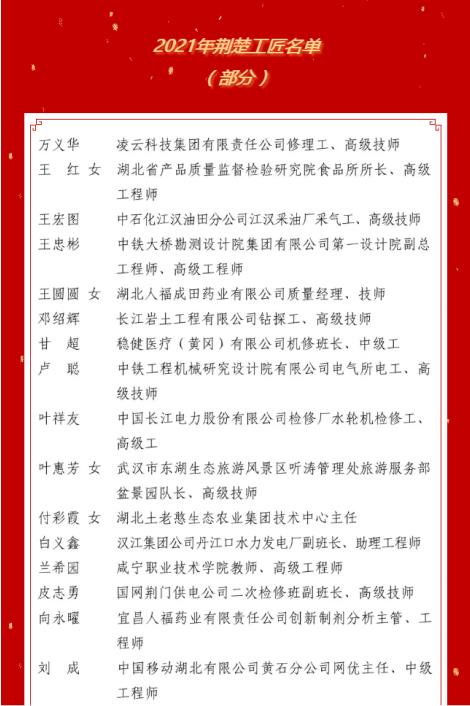 ? ? ?11月10日,在2021年荊楚工匠培育創建工作視頻會議上,湖北省總工會公布100位2021年“荊楚工匠”,人福醫藥集團向永曜和王圓圓入選。
